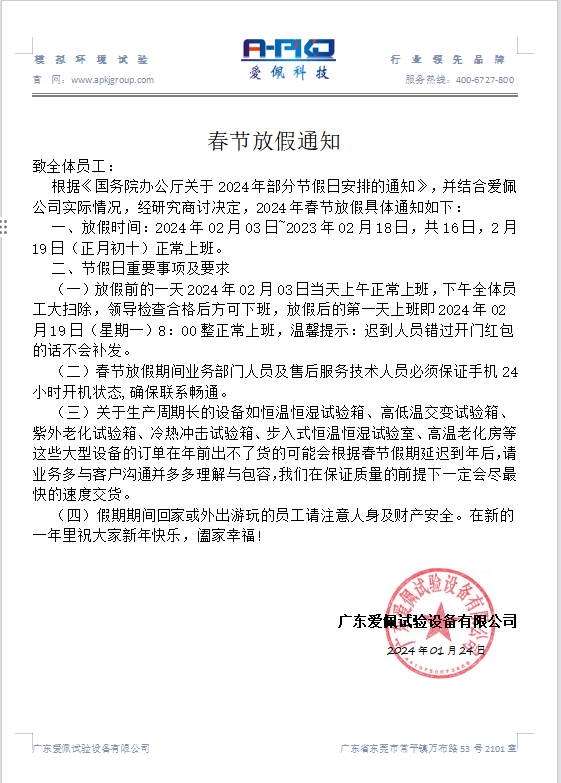- 廣東愛佩試驗(yàn)設(shè)備有限公司春節(jié)放假通知