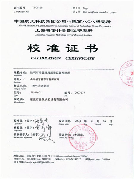 老化箱校準(zhǔn)證書