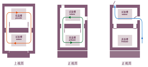 結(jié)構(gòu)分為高溫區(qū)、低溫區(qū)、測試區(qū)三部分,測試樣品完全靜止于測試區(qū)。采用獨特之蓄熱、蓄冷結(jié)構(gòu),強制冷熱風(fēng)路切換方式導(dǎo)入測試區(qū),沖擊時高溫區(qū)或低溫區(qū)的溫度沖入測試區(qū)進行沖擊,完成冷熱溫度沖擊測試。